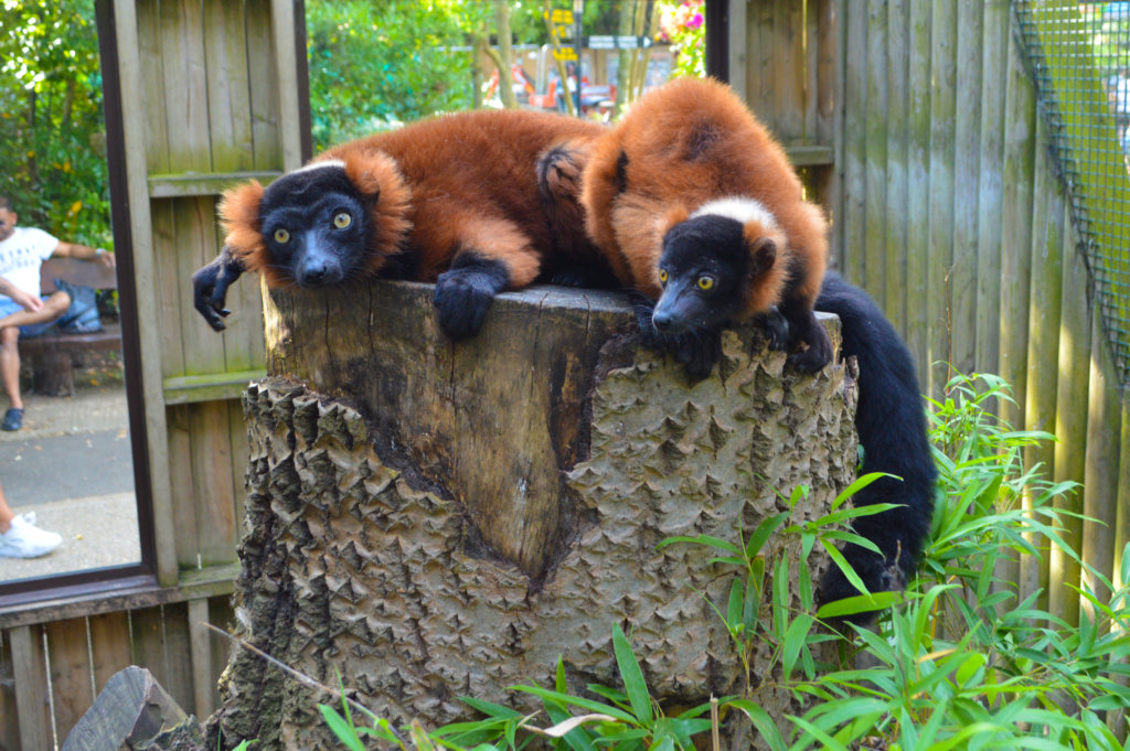 Sometimes these families are grouped in loose communities of up to 30 animals. The animals keep in touch while travelling through the forest, and come together when a fruiting tree is found. Neighbouring groups call to each other through the forest with raucous calls. They have an elaborate system of alarm calls which alert group members to danger. Red ruffed lemurs produce litters of offspring and can have up to six infants at one time, but more usually twins are produced. They are also unusual in that they do not carry their young on their stomachs or backs but instead leave their babies in a nest of leaves whilst they go off to find food alone.